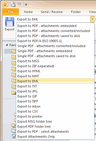 In addition to .eml and .mbox, MessageExport also adds other export formats to Outlook, such as .pdf, .msg, mhtml, gif, tif, text, html, and many others.